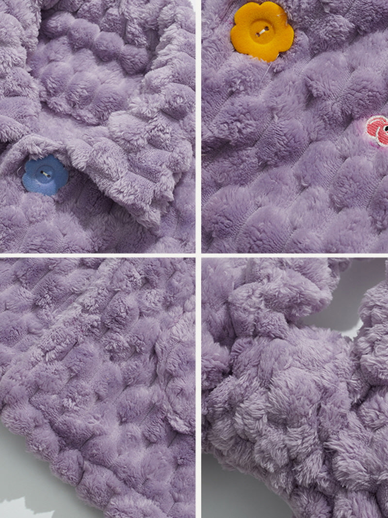 Slip into softness with this plush lavender pajama set, made from ultra-cozy bubble fleece. Rainbow-colored buttons add a fun pop, and the matching ribbon headband completes the look. Snuggly, cute, and effortlessly stylish—perfect for bedtime or chill time. Feel like a pastel dream from head to toe.