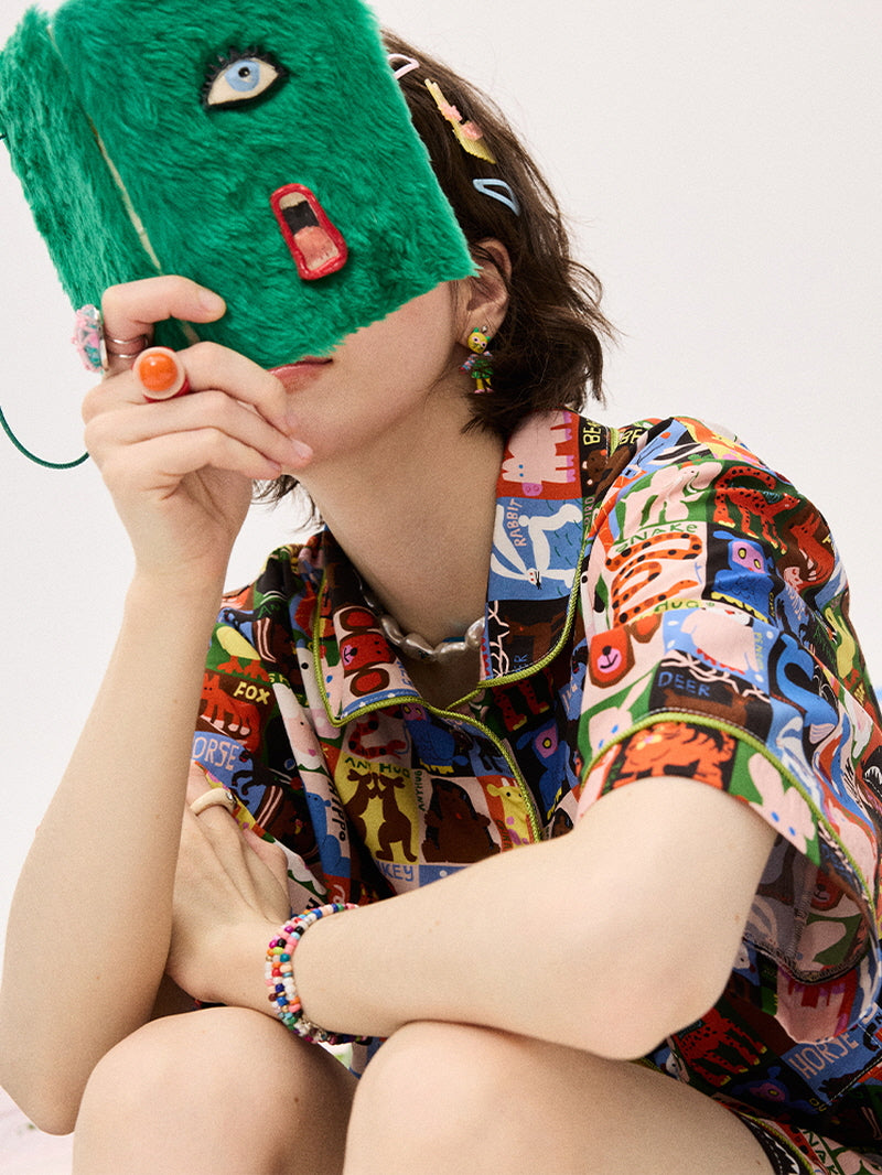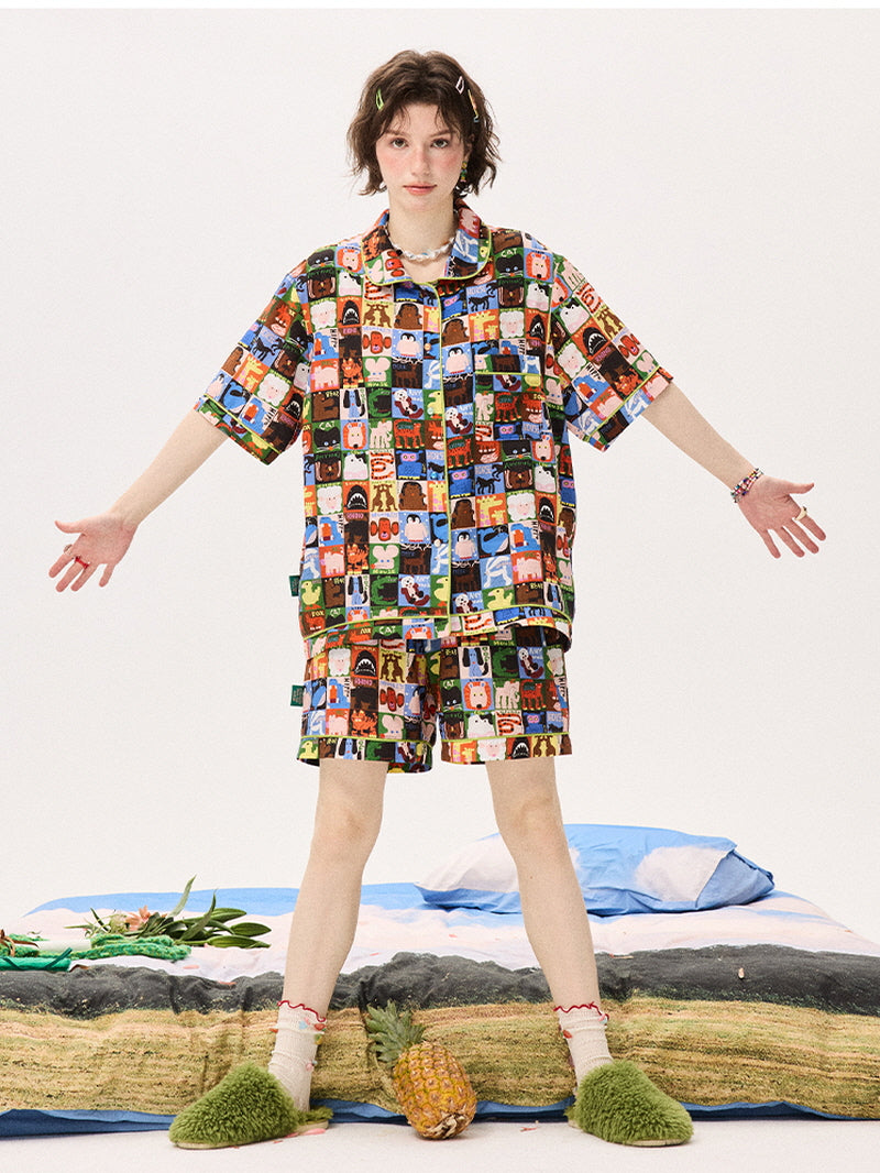 This pajama set features an energetic patchwork of quirky characters in a bold color grid. Crafted from cool-touch ice silk satin (96% polyester, 4% spandex), it offers a sleek, breathable, and silky-soft fit. The relaxed silhouette keeps you comfortable while making a playful style statement. Perfect for dreamers with a cartoon heart.