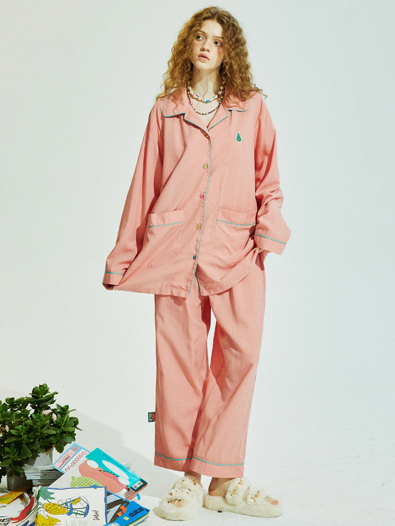 Slip into softness with this dusty pink pajama set made from sustainable Lyocell fabric. Delicate blue piping and pastel buttons add a clean, modern touch to the relaxed silhouette. Naturally breathable and silky-smooth, it's perfect for winding down in comfort and style. Your new favorite for slow mornings and cozy nights.