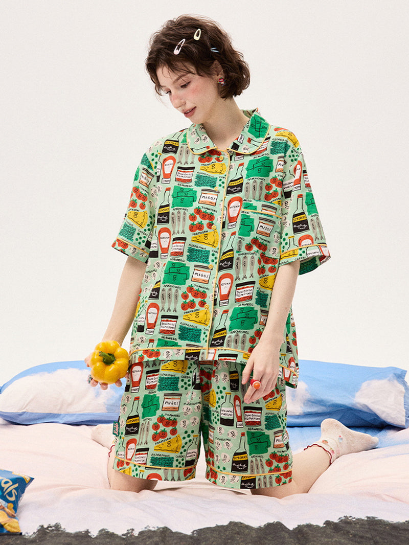 Spice up your sleepwear with this grocery-inspired pajama set, splashed with labels, tomatoes, and pantry staples. Crafted from 60s breathable Tencel velvet using 100% Lyocell fiber—soft, cool, and gentle on skin. Its minty green base brings a fresh look to your downtime. Perfect for lounging, snacking, and looking adorably out-of-the-box.