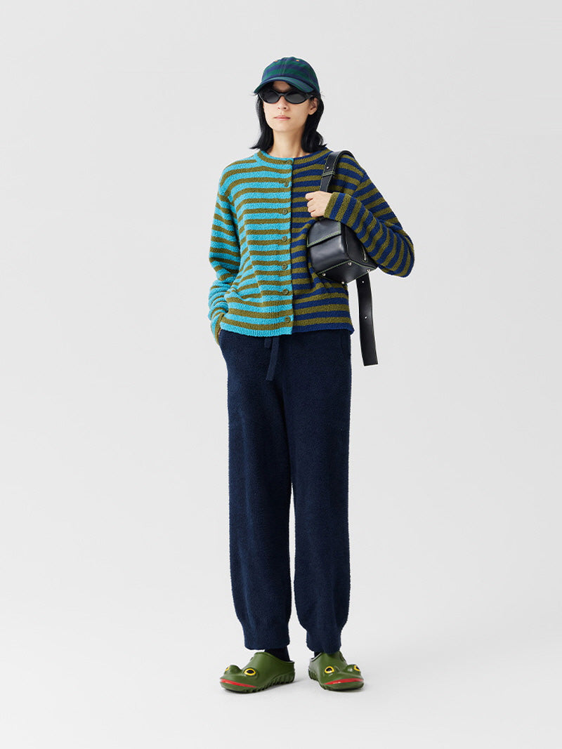 A bold mix of navy and green stripes gives this knit pajama set a modern twist. Designed with asymmetrical striping for an effortlessly cool look, the soft, plush texture wraps you in all-day comfort. Perfect as stylish homewear or casual loungewear – from coffee runs to cozy nights in.