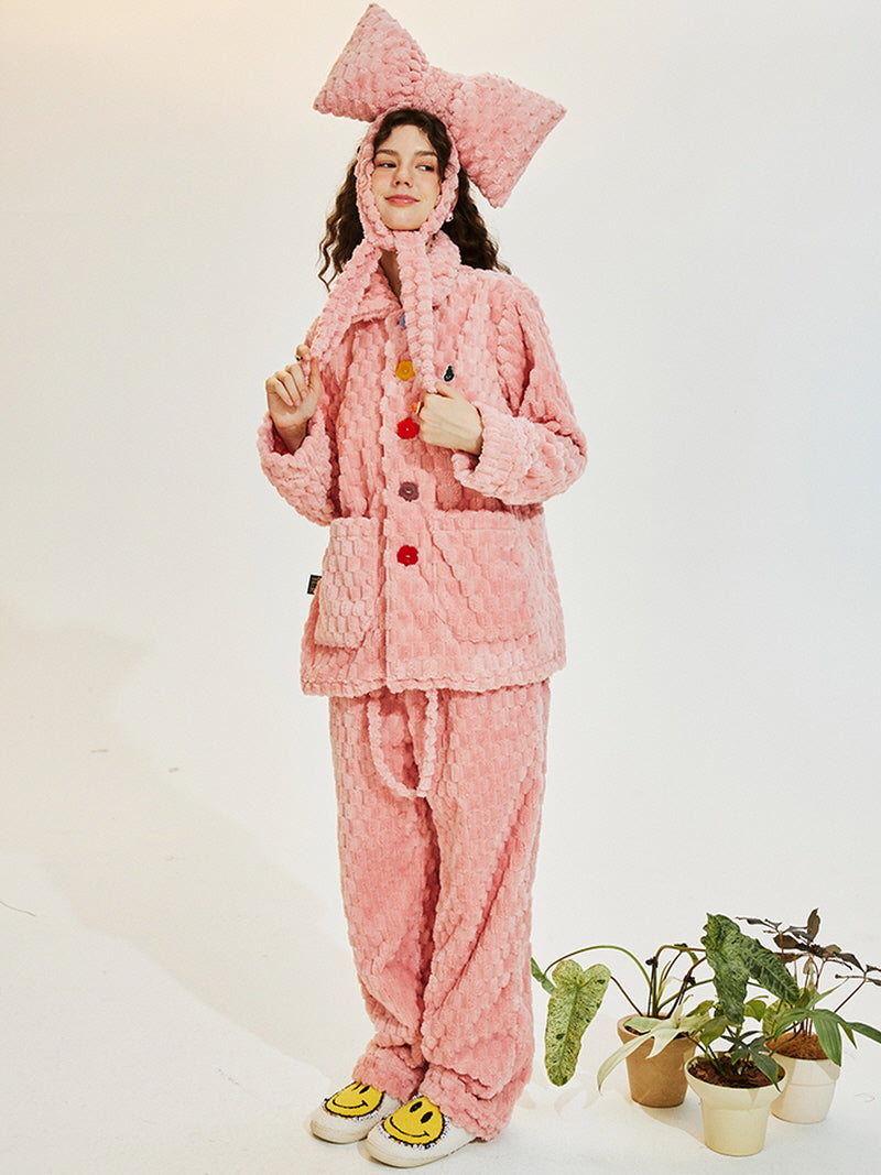 Wrap yourself in pure cuteness with this pink bubble-textured pajama set. Adorned with colorful buttons and a matching plush ribbon headband, it's made for cozy lounging and playful selfies. The soft, bouncy fabric hugs you gently for all-day comfort. Sleep, chill, repeat—with a bow on top.